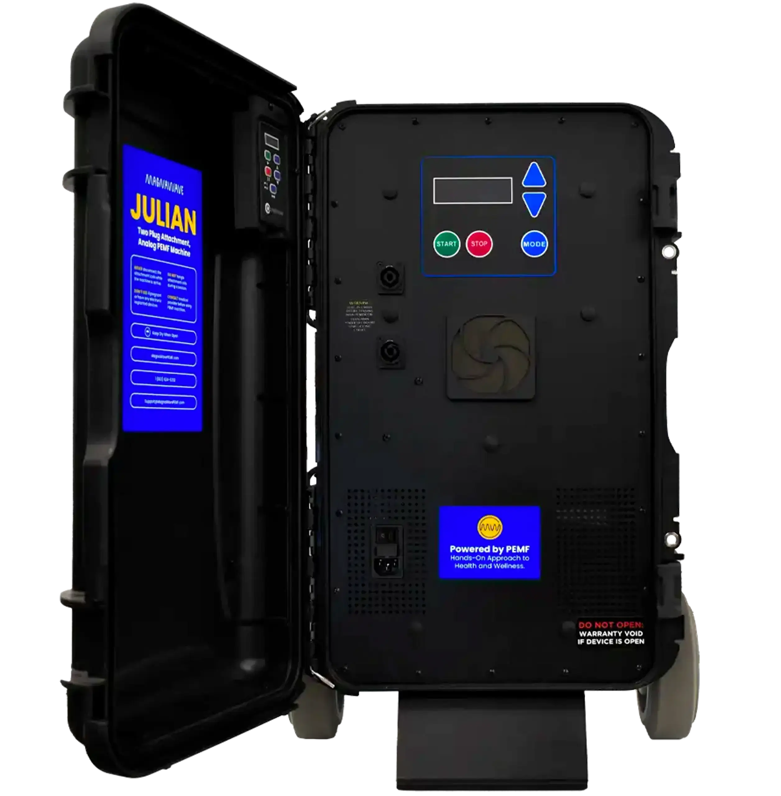 The Julian is MagnaWave’s flagship analog machine, built for strong output, portability, and consistent daily use. With 20 intensity settings, remote-capable operation, and a 1–90 minute timer, it is designed for professionals who want dependable power in a travel-ready platform. It fits especially well in performance-focused barns, show programs, and busy professional practices that need strong MagnaWave sessions throughout the day.